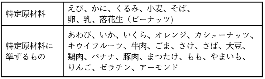 「特定原材料」(8品目)が表示義務とされており、「特定原材料に準ずるもの」(20品目)が表示推奨となっております。