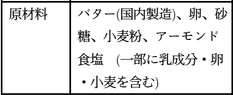 上記の場合では、原材料として「バター」が一番多く含まれており、「卵」「砂糖」「小麦粉」「アーモンド」「食塩」の順番に多く含まれています。