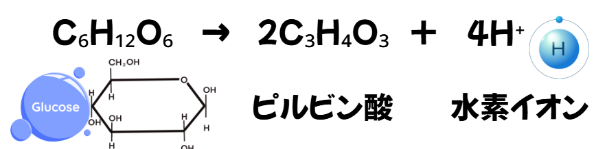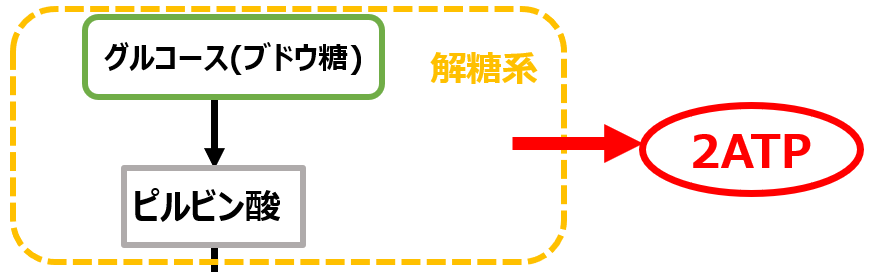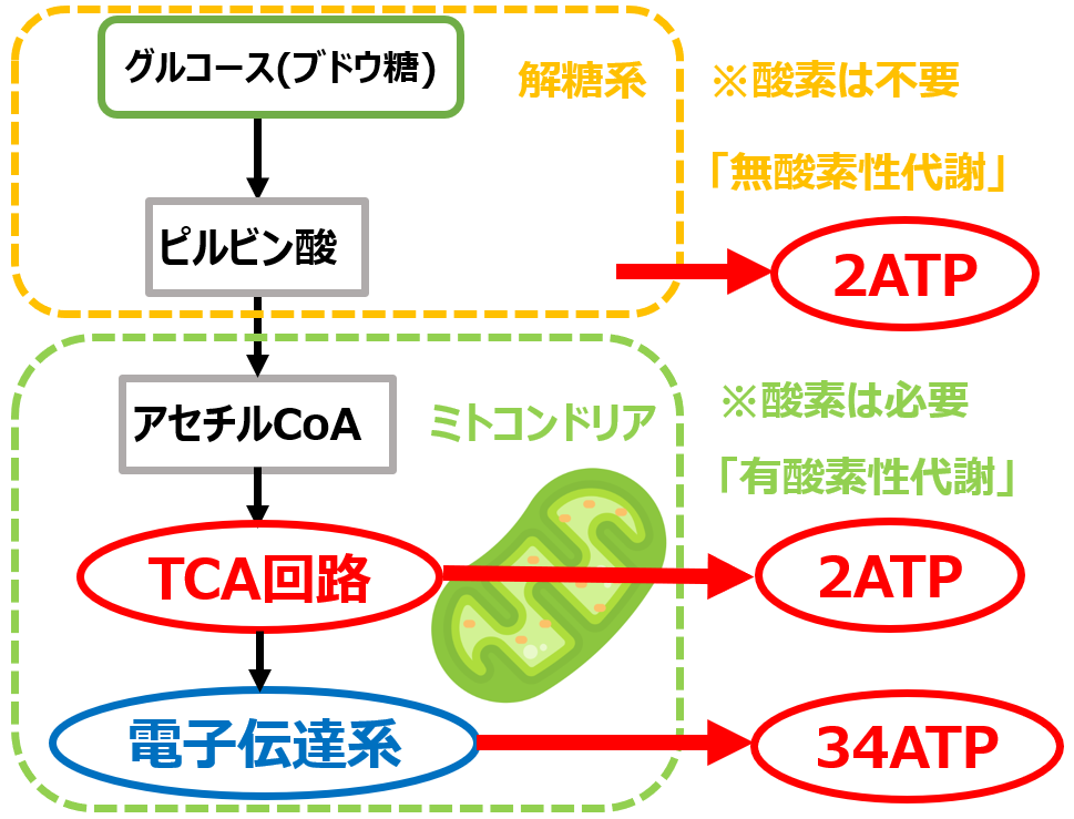 ブドウ糖は、細胞質の「解糖系」において、酸素を利用しない代謝「無酸素性代謝」によってATPを生み出します。