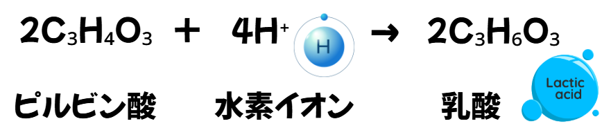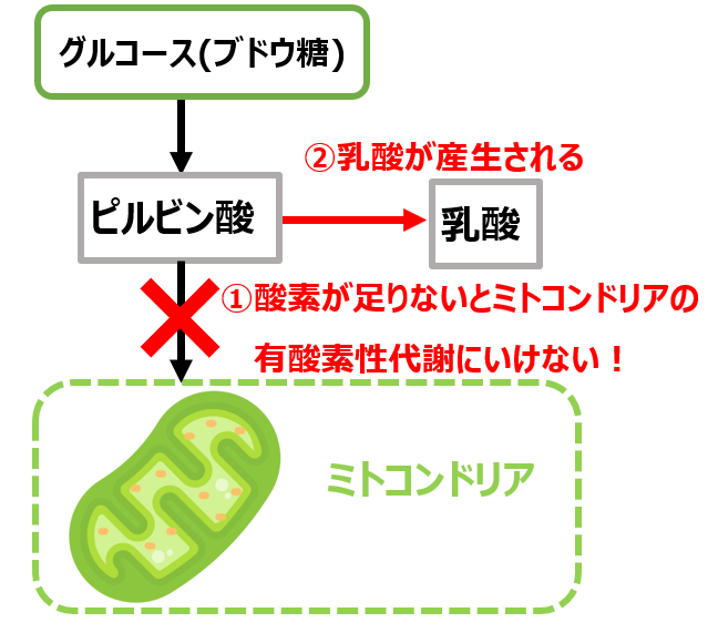 しかし、酸素が足りないと、ミトコンドリア内の有酸素性代謝に進むことができず、「ピルビン酸」から「乳酸」が産生されることになります。