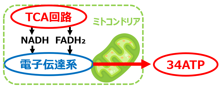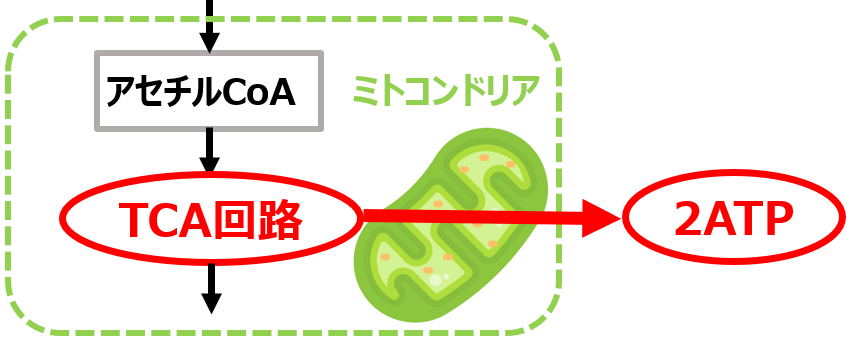 「ピルビン酸」は「アセチルCoA」に変換し、「TCA回路(クエン酸回路)」においてATPが生み出されます。